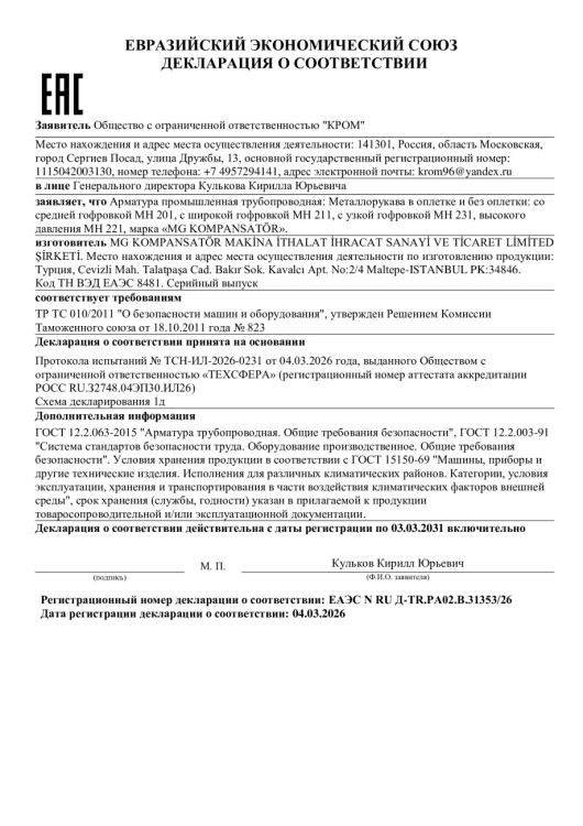 Декларация ТР ТС 010 металлорукава